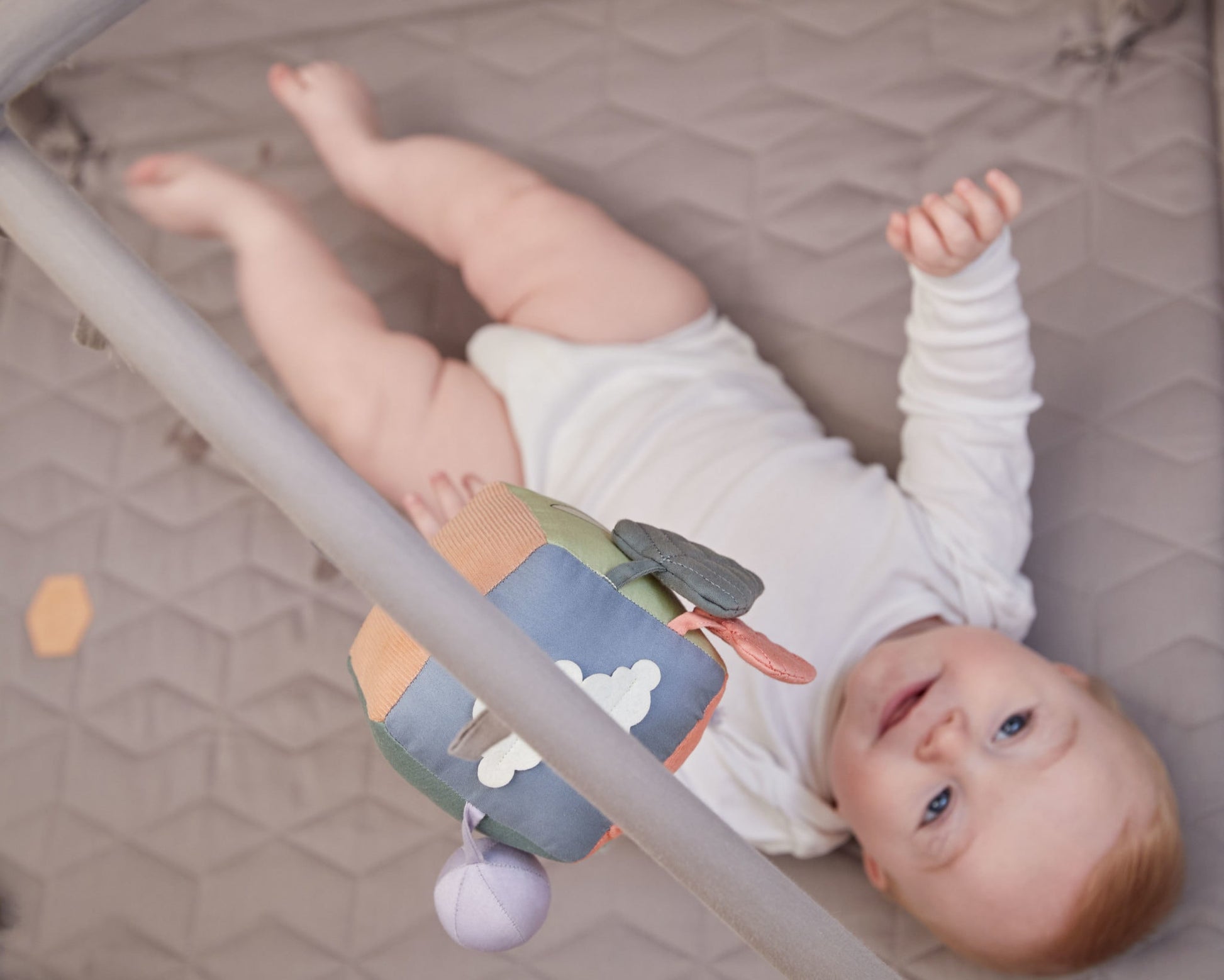 Activity toys with inspiration from the Nordic nature, produced in 100% organic cotton. The soft square is designed with different elements on each side; mirror, bell, illustrations, crackle sound, and various parts that are fun for the baby to touch. A fine toy that both stimulates the child's vision and sense of hearing and develops the child's fine motor skills. It has a velcro closure on the strap that makes it possible to use the activity toy on our fine activity nest, over the changing table or on the baby car seat.