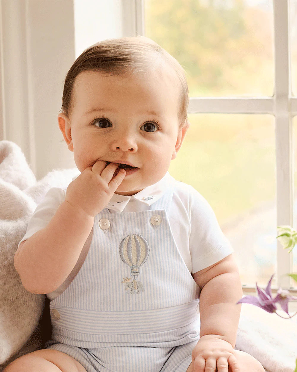 Introducing The Ace Balloon Dream Dungaree that features our blue and white oxford stripe and embroidered hot air balloon elephant design.