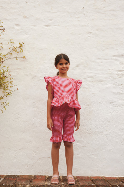 Adorable and fun Alisa smocked shorts in pink and red gingham cotton. Features fully elasticated comfortable smock. Matches perfectly with a Heidi blouse or Alisa top or vest.