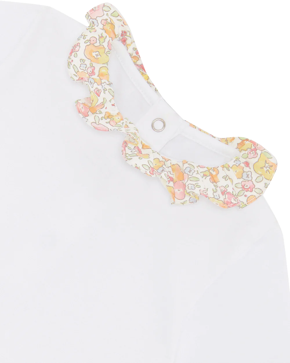 The Ana Olympia Embroidered ruffle collar onesie features this season’s yellow Olympia floral print