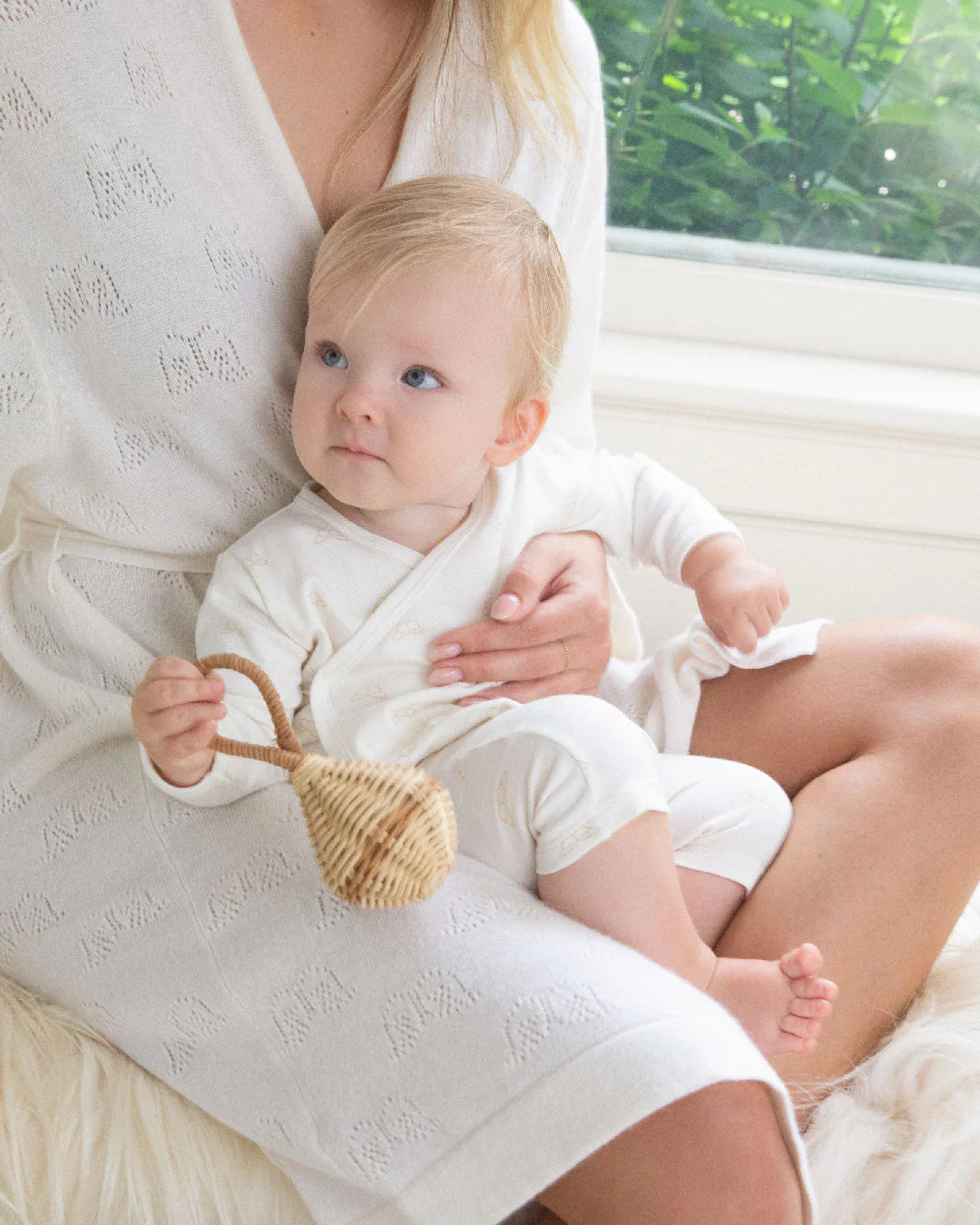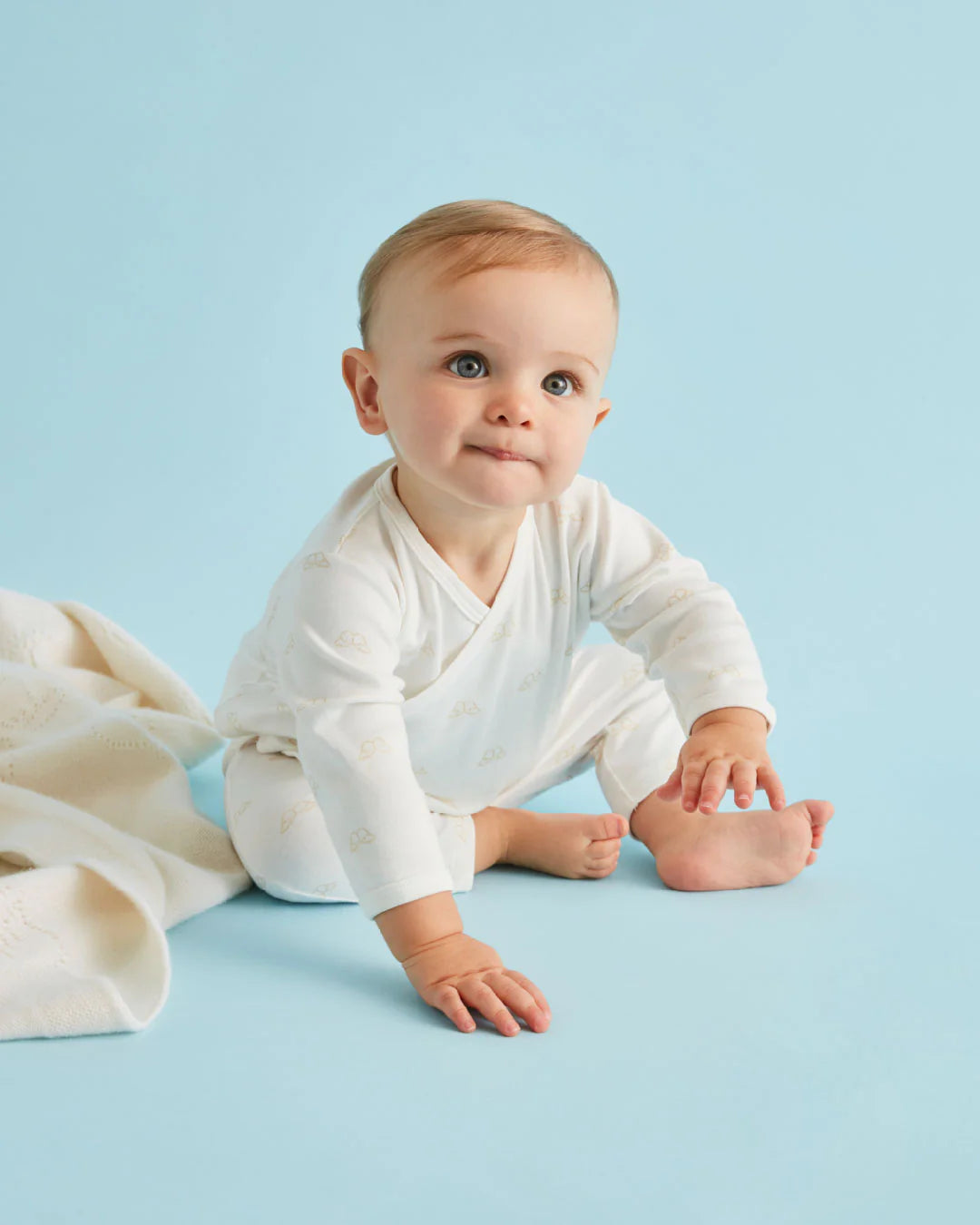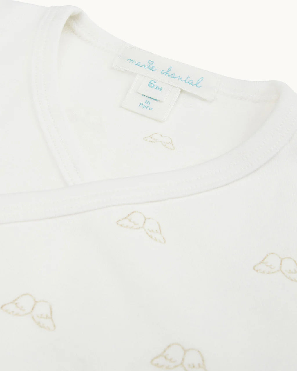 Indulge your little one with our heavenly Angel Wing™ Two Piece Set.Crafted from the softest Pima Cotton, this luxurious ensemble comes in a delicate pink and pure fresh white, providing the ultimate comfort for your little one. The wrap top, with its adorable dainty side tie, adds a touch of style to this adorable outfit. perfectly coordinated with the matching printed Angel Wing™ bottoms.