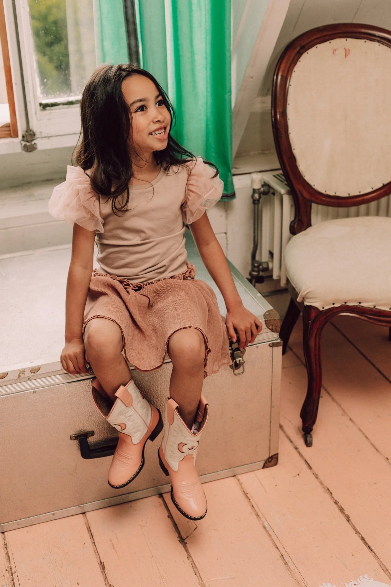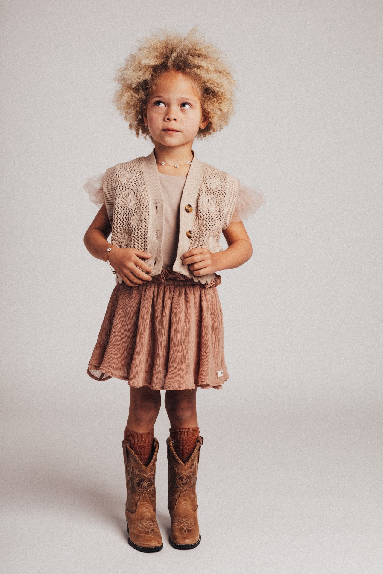 This stylish skirt in woven crinkle fabric is a versatile addition to any child's wardrobe. The luxurious crinkle fabric gives the skirt a beautiful texture and a refined look, while the airy design ensures a beautiful, elegant fit. Pair it with the blouse Lou for a chic look, or with the jersey shirt Loule for a casual, yet refined outfit. This skirt is perfect for both formal and informal occasions and offers endless possibilities for styling.