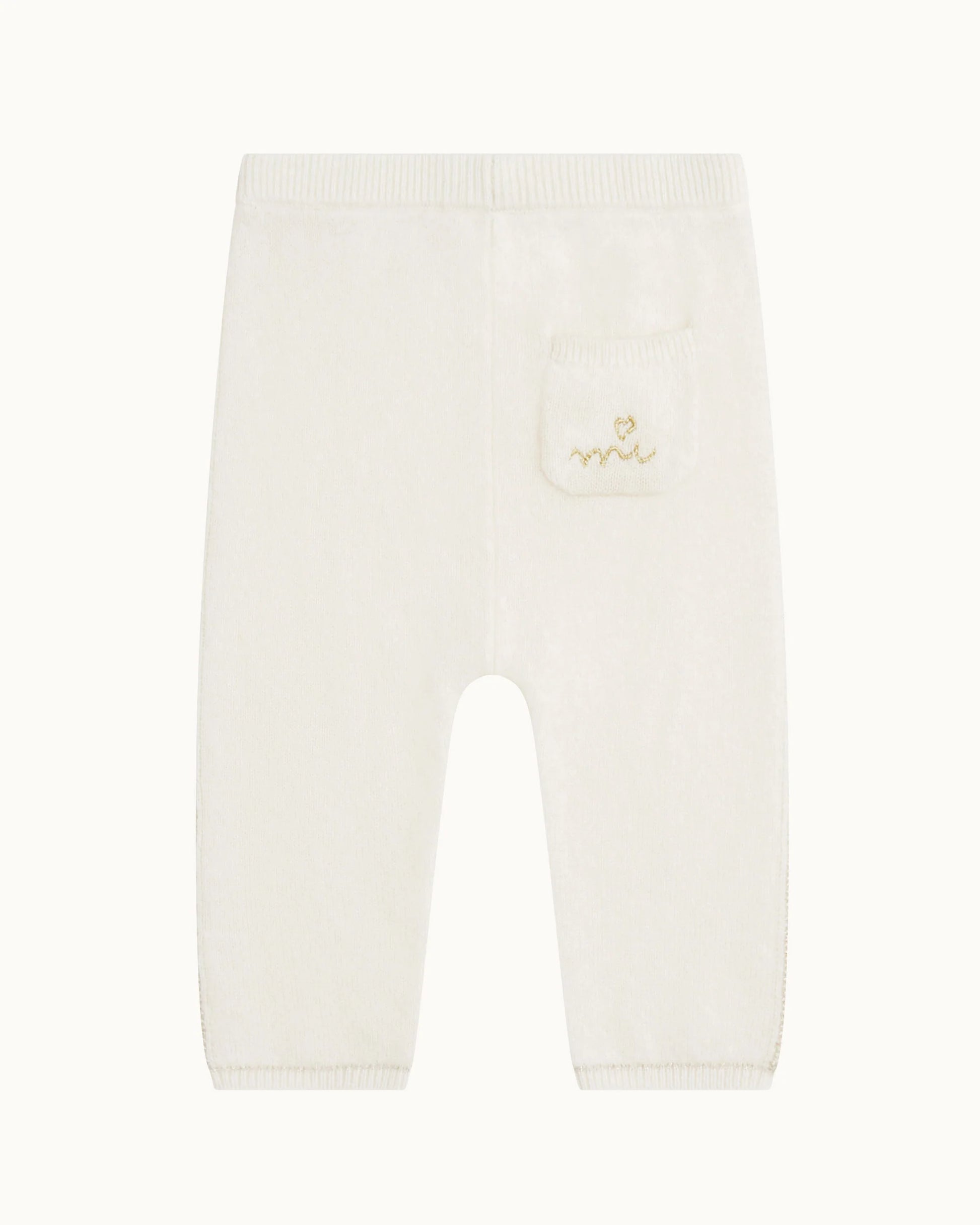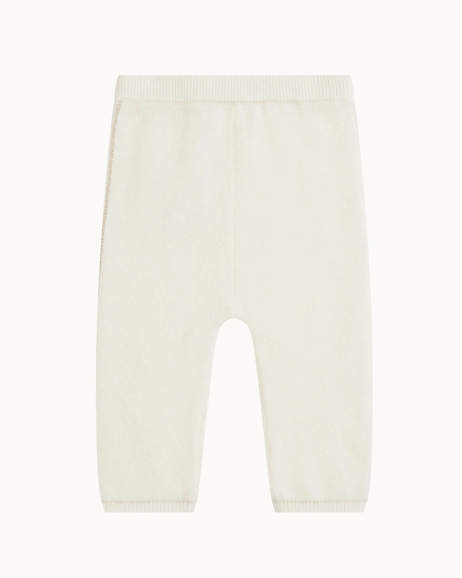 Made from the softest cashmere, the classic Briony Angel Wing Cashmere Leggings in ivory feature gold trim down sides and on back pocket.