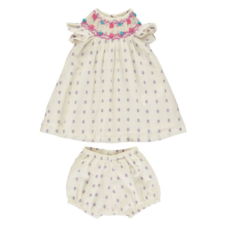 Diana baby set is full of throwback charm with its vintage-inspired micro floral print, short butterfly sleeves and smocked neckline with adorable handmade floral embroidery. The set comes with matching bloomers.
