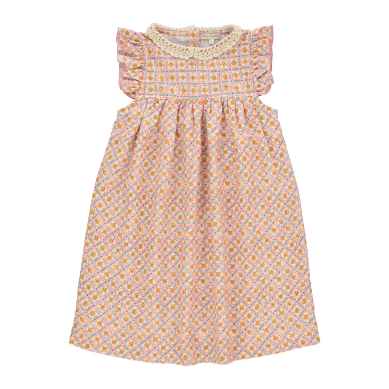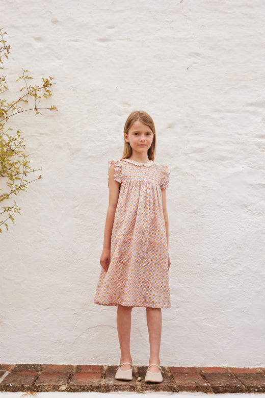 Ode to a nostalgic childhood. Beloved Eloise dress in adorable geometric floral print in linen and cotton fabric blend with mother-of-pearl buttons in the back. Timeless silhouette is paired with a hand crochet collar and butterfly sleeves - comes together like a melody – it’s the loveliest tune for warm summer afternoons and childlike wonders.