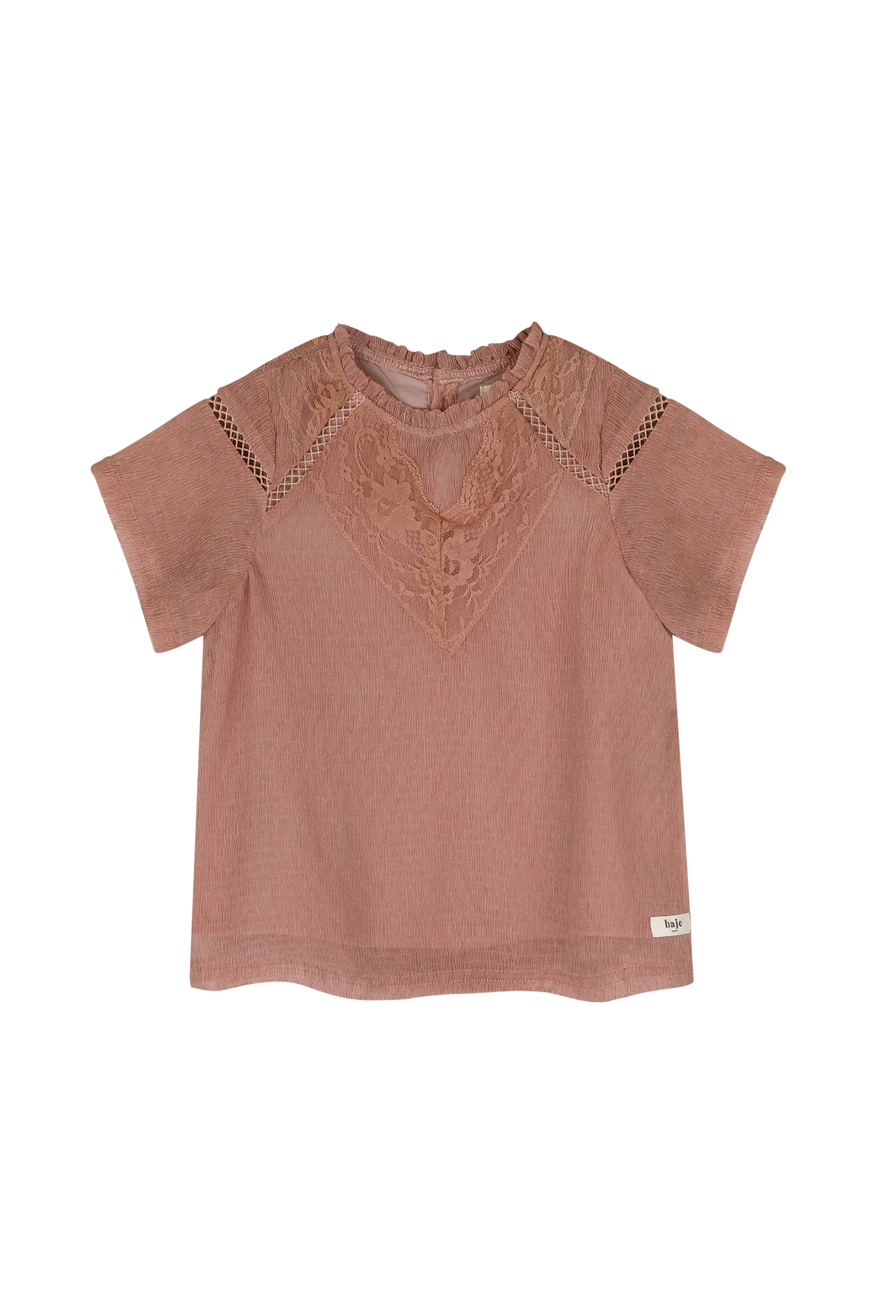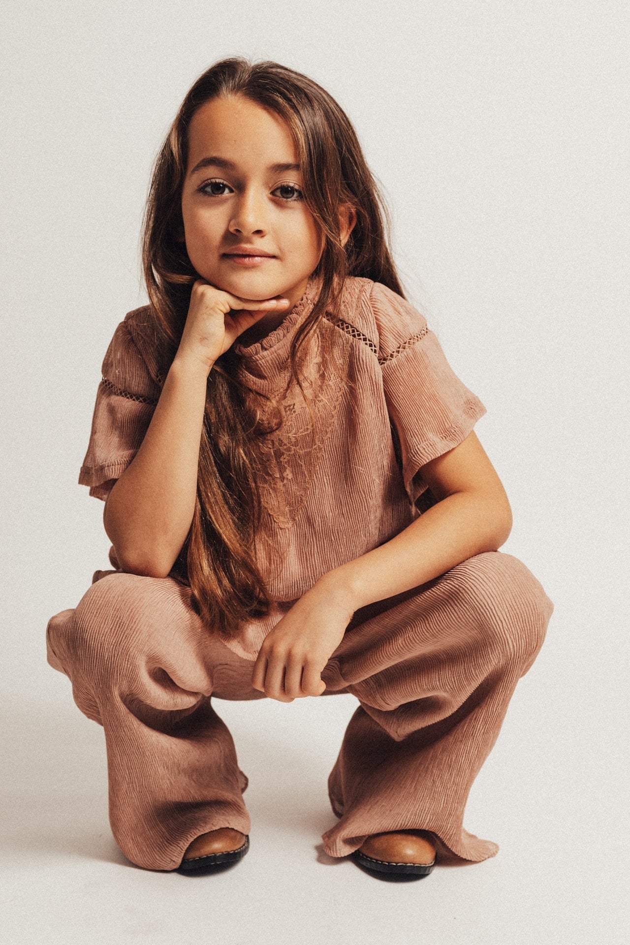 This oversized blouse for girls is the choice to shine at a party or other occasion! The striking design with tape details on the front gives the blouse a playful, yet chic look, while the luxurious woven crinkle viscose fabric ensures a rich, refined look that accentuates every movement. Perfect for a party, wedding or special occasion, where your daughter wants to steal the show. The blouse falls beautifully and airily, allowing her to move freely and feel beautiful at the same time. Perfect to combine with the Giao children's trousers and the Birre children's skirt