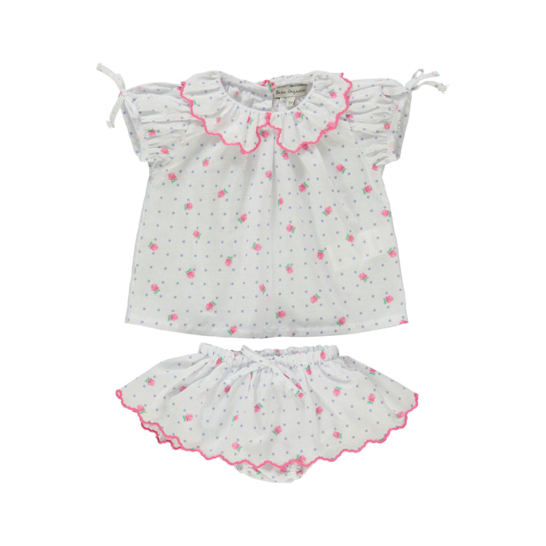 Our summer dreams are made of this! Newest print for spring/summer season - cutest raspberries with lavender dots. Lyla baby set is full of throwback charm with its vintage-inspired print, short puff sleeves with bow detailing, and ruffled embroidered collar. Set comes with an adorable ruffled bloomer with embroidered skirting.