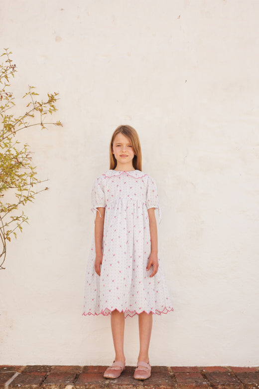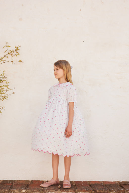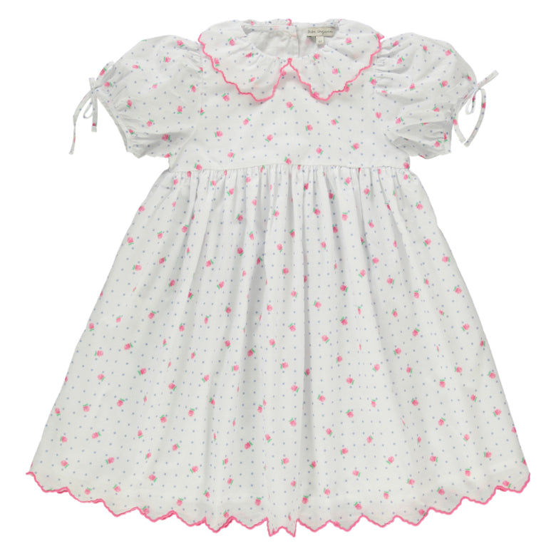 Our summer dreams are made of this! Newest print for spring/summer season - cutest raspberries with lavender dots. Adorable Lyla dress is full of throwback charm with its vintage-inspired print, short puff sleeves with bow detailing, ruffled embroidered collar and hemline. Back closure with mother-of-pearl buttons. Flouncy skirt - perfect for twirling.