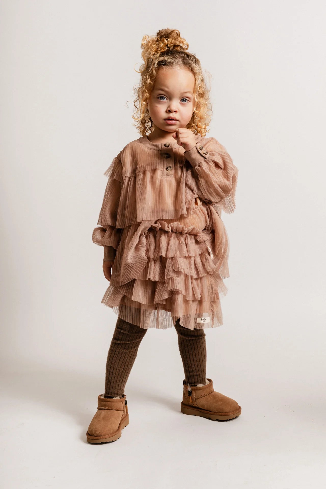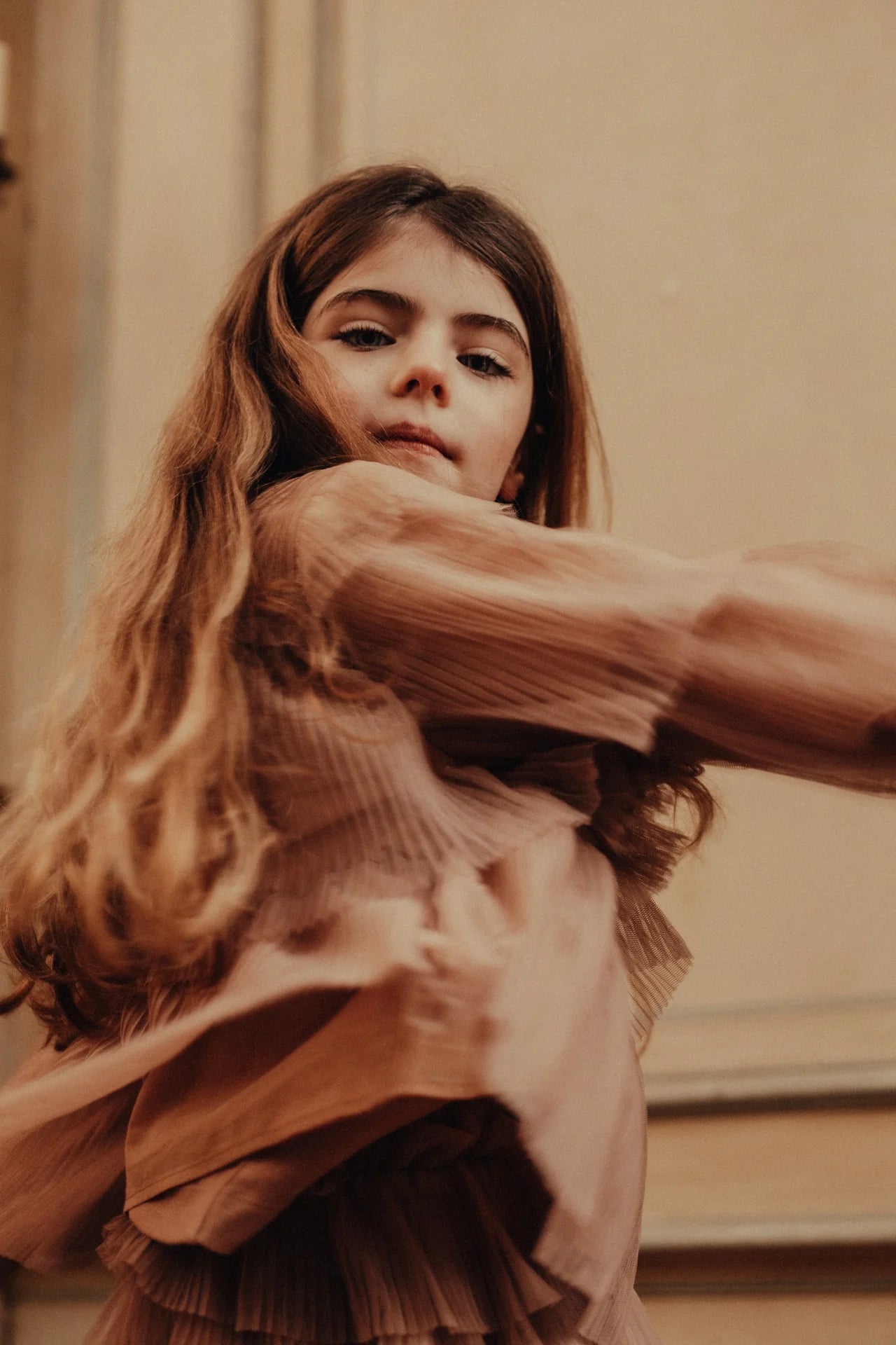 Unique girls blouse pleated - available in peach/sand and brown This elegant girls blouse with long sleeves is a real eye-catcher. The blouse is made of an airy pleated fabric that gives a playful and graceful effect. The layered layers and subtle sheen provide a stylish look, while the button closure at the front gives the whole a classic detail. ✔ Unique pleated fabric with an airy and flowy effect ✔ With button closure and layered details ✔ Comfortable fit, suitable for festive and casual use ✔ Perfect to combine with a skirt, leggings or jeans With this unique girls blouse you choose a special outfit that can be worn both festive and playful. Ideal for special occasions or to give an everyday look that little bit extra.