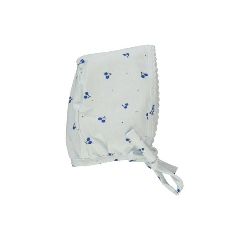 Noah Bonnet in the cutest blue cherry print is crafted from the softest organic cotton. Features snug comfortable fit and ribbon ties under the chin. A lovely and must-have item that can be matched with all Noah line products.