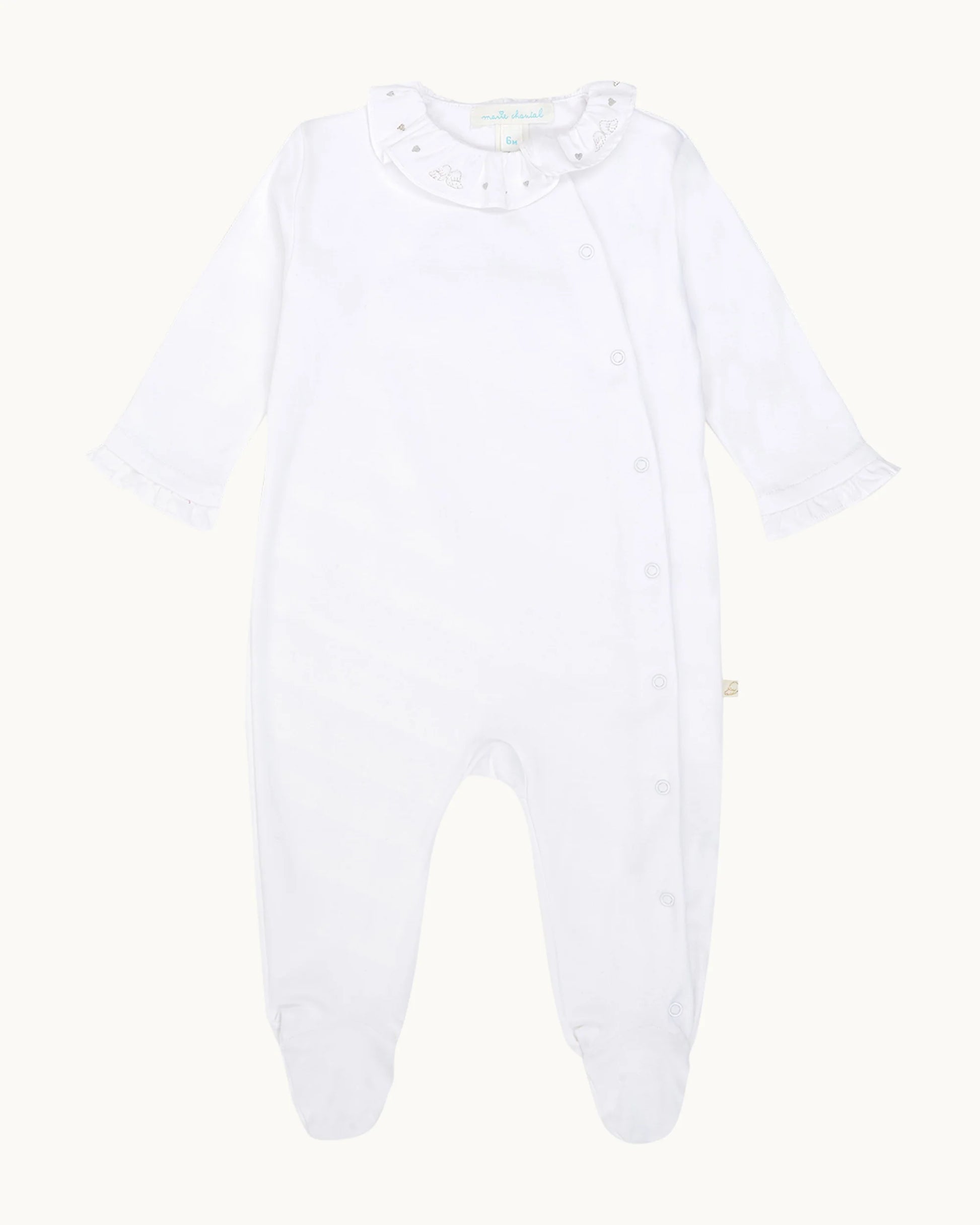 Made from the softest Pima Cotton, Marie-Chantal's best-selling Angel Wing Sleepsuit in White features the signature Angel Wing design in Silver and an embroidered ruffle collar.