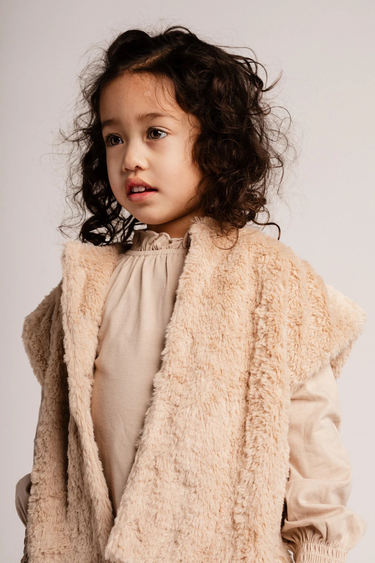 Girls' faux fur vest - stylish & wonderfully soft This beautiful girls' faux fur vest is the finishing touch to any outfit. The vest feels super soft and instantly gives a stylish, luxurious look. Thanks to the neutral sand color, this item can be combined endlessly - from festive dresses to a casual jeans look. ✔ Made of high-quality faux fur - sustainable & animal friendly ✔ Wonderfully soft and warm ✔ Neutral sand color, easy to combine ✔ Ideal as an extra layer for autumn and winter ✔ Perfect for both festive and everyday outfits