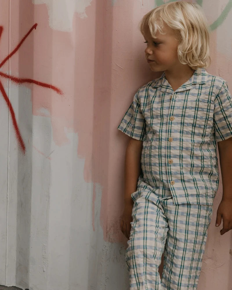 Short-sleeved shirt for baby in a light cotton seersucker quality with collar. The shirt has button closure and a sewn-on chest pocket at the front. Perfect to combine with our muslin shorts, bloomers or pants.
