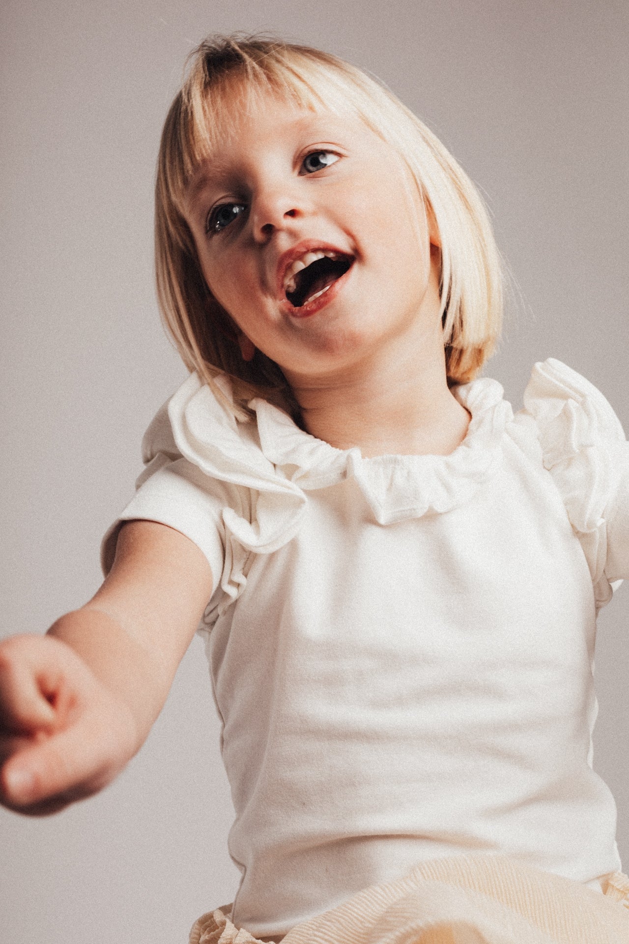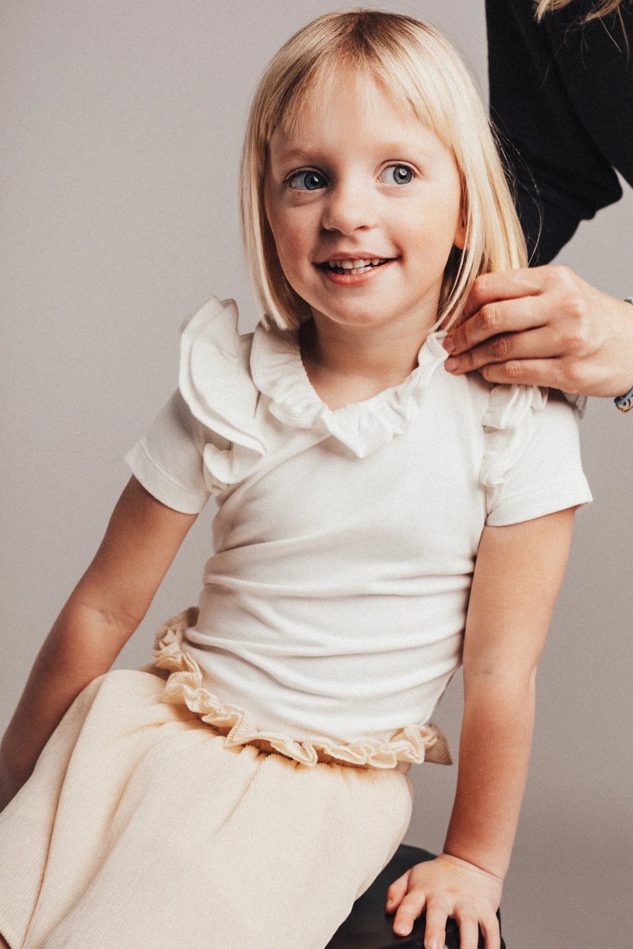 This stylish girls' shirt is a perfect basic item with a luxurious twist. The soft and breathable material falls smoothly around your girl's body, while the beautiful ruffled sleeves give the whole a special,refined look. A versatile garment that can be worn both casual and chic.