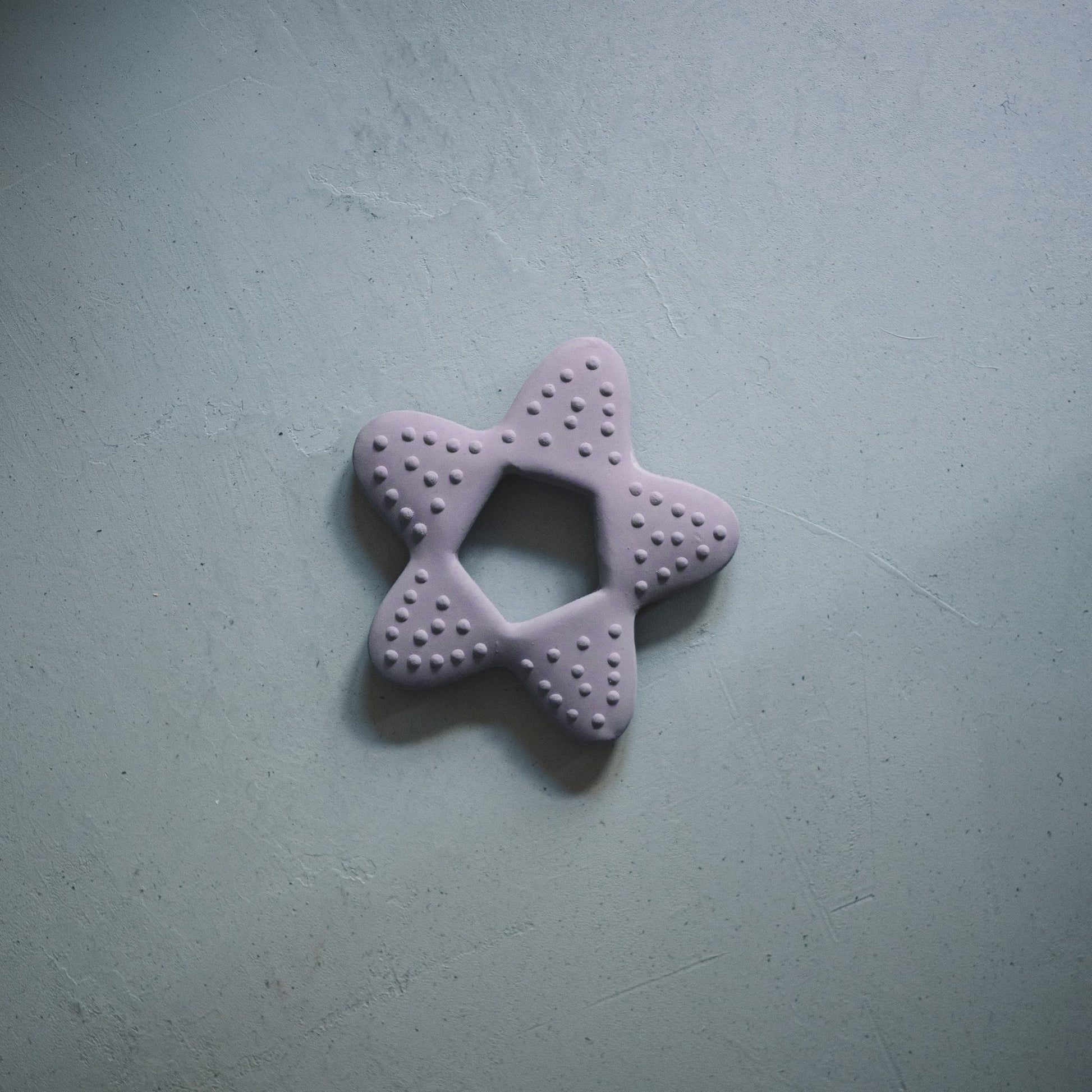 Star-shaped teether produced in 100% natural rubber. The star is designed with a hole in the middle, which provides a good grip for even very small hands. On the surface, small dots have been produced and all edges are soft, which can help on sore gums and at the same time stimulate the tactile sense. Great product for developing the child's fine motor skills.