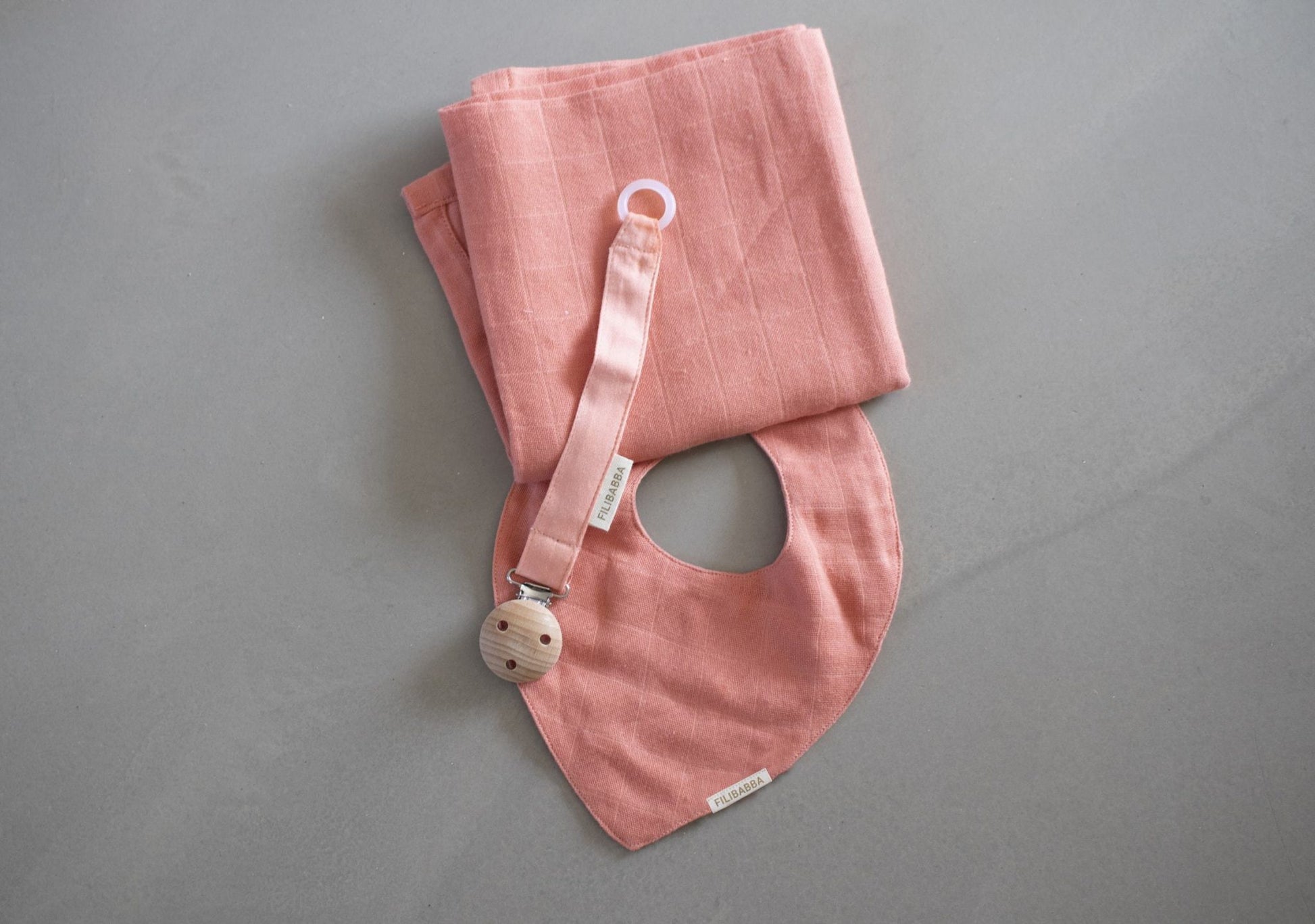 Beautiful bib in 100% organic GOTS-certified muslin cotton. The bib is designed with a membrane between both muslin layers, which helps to reduce fluid absorption through the product. The bib is closed with a push button in the neck, where it is possible to choose two sizes.