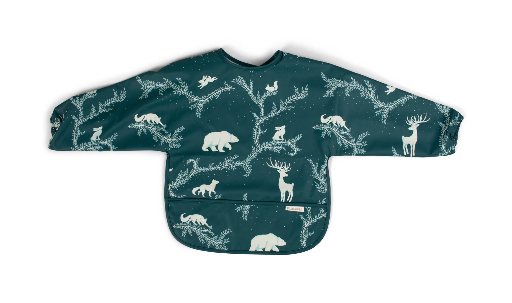 This beautiful bib with sleeves has your back at dinner time. With a spacious pocket at the bottom, our bib collects food and liquids and with elastic bands at the wrist and velcro closure at the neck, our bib fits your child just perfectly.