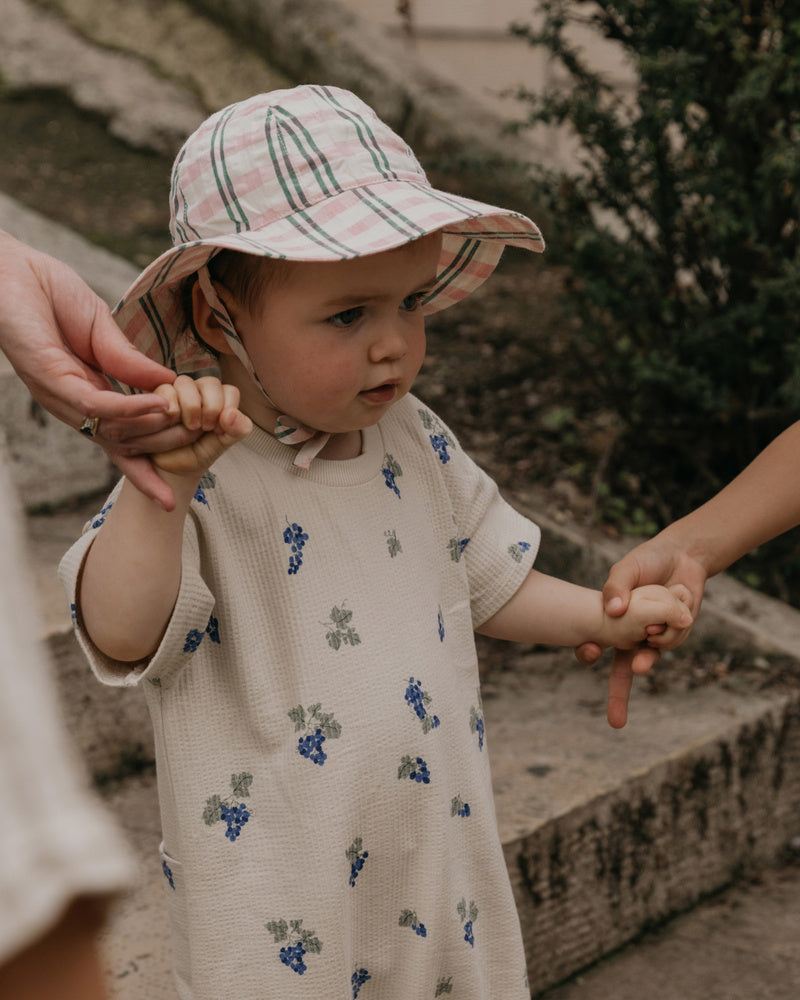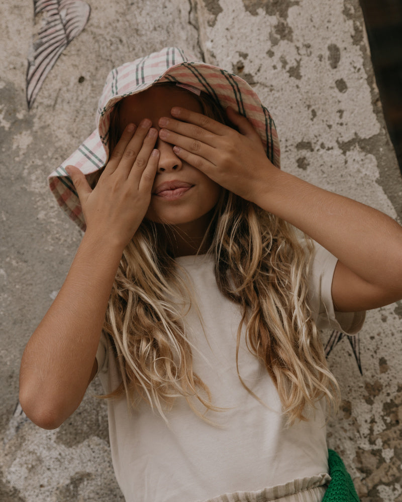 Sun hat in a light cotton seersucker quality with elastic at the back for a perfect fit. The hat is lined with solid colored cotton lining and has drawstrings under the chin to keep the sun hat in place on the two smallest sizes. Does not provide protection against reflected or scattered ultraviolet radiation. Put together the perfect summer outfit by combining with our other muslin styles.